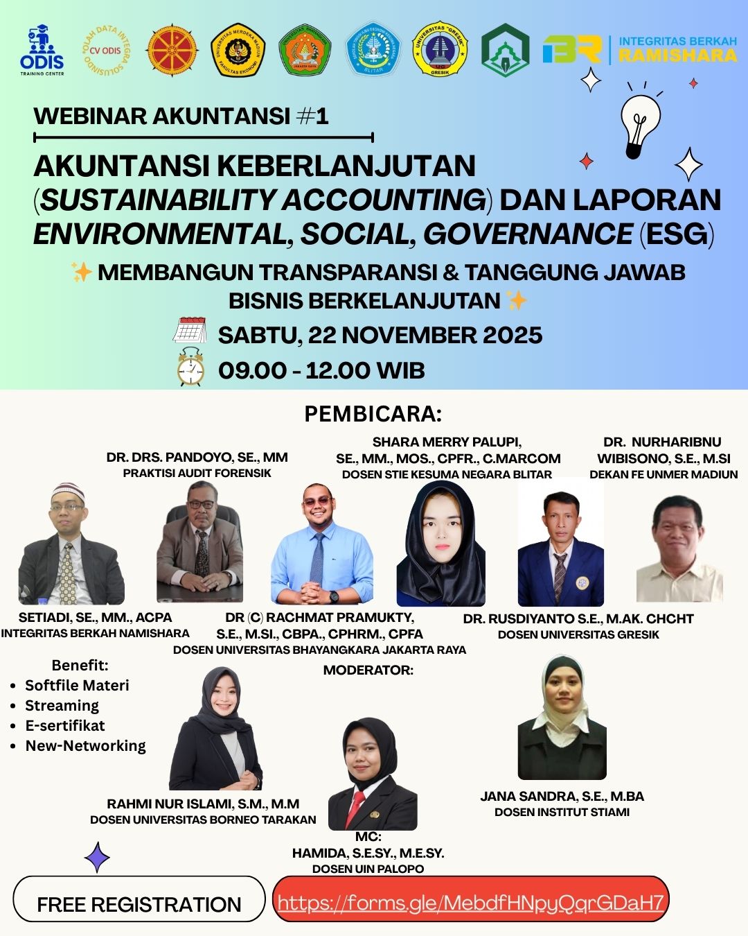 Karangrejo, 22 November 2025 — CV ODIS Training Center bersama sejumlah perguruan tinggi mitra menyelenggarakan Webinar Akuntansi #1 dengan tema “Akuntansi Keberlanjutan (Sustainability Accounting) dan Laporan Environmental, Social, Governance (ESG)”. Kegiatan ini bertujuan memperkuat pemahaman akademisi, mahasiswa, dan praktisi mengenai pentingnya transparansi dan akuntabilitas dalam praktik bisnis berkelanjutan.